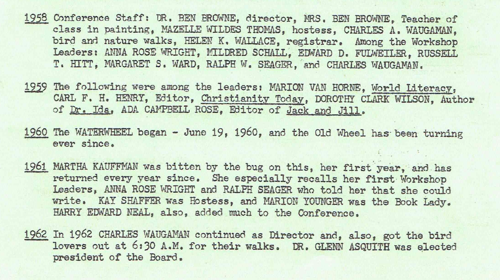 Fewer than thirty persons attended the first conference at St. Davids, including a staff comprised largely of writers and editors associated with the American Baptists. In those beginning years, Dr. Browne was fond of quoting, “Write the vision and make it plain.” In The Writers’ Conference Comes to You (Judson Press, 1956), he wrote, “Perhaps that which we all need most is renewed faith in the greatness of the written word. We need to remember that though the temples and forums of Greece and Rome are in ruins, and though the Temple at Jerusalem has not one stone left upon another, the writings of these rich civilizations, Grecian, Roman, and Hebrew, endure and remain forever with us in all their eternal vitality.”